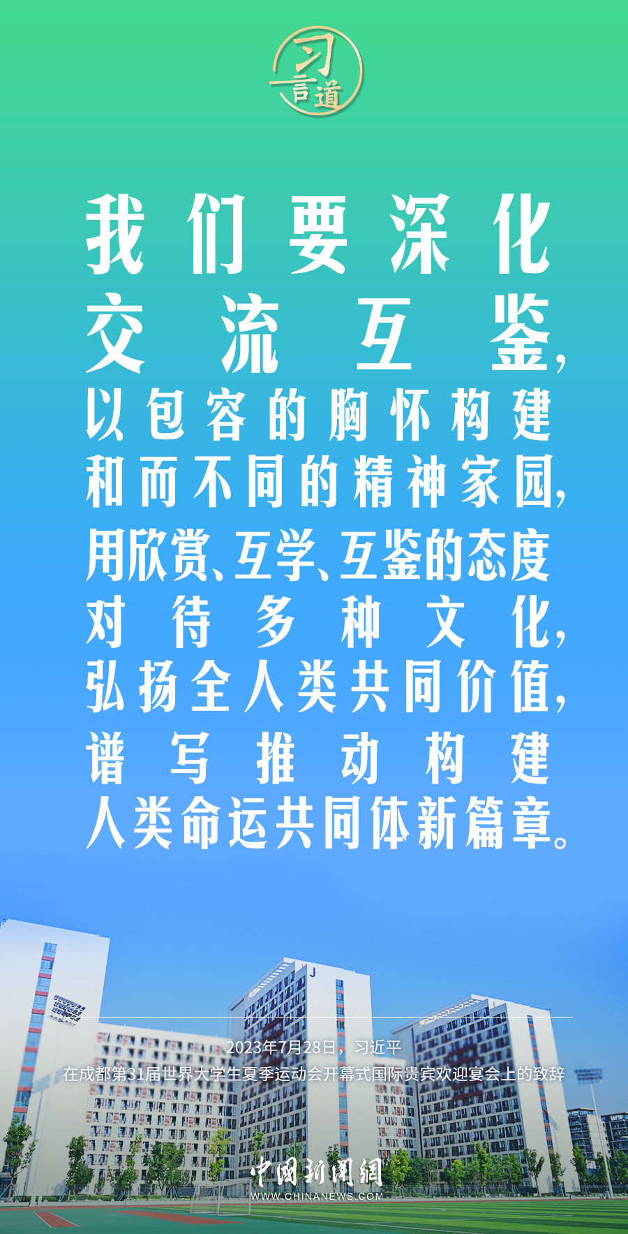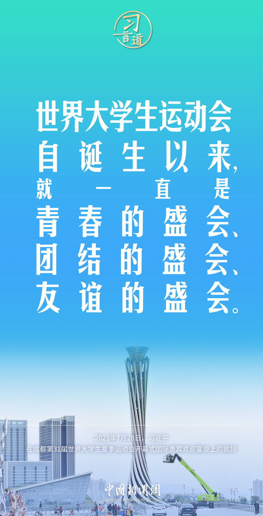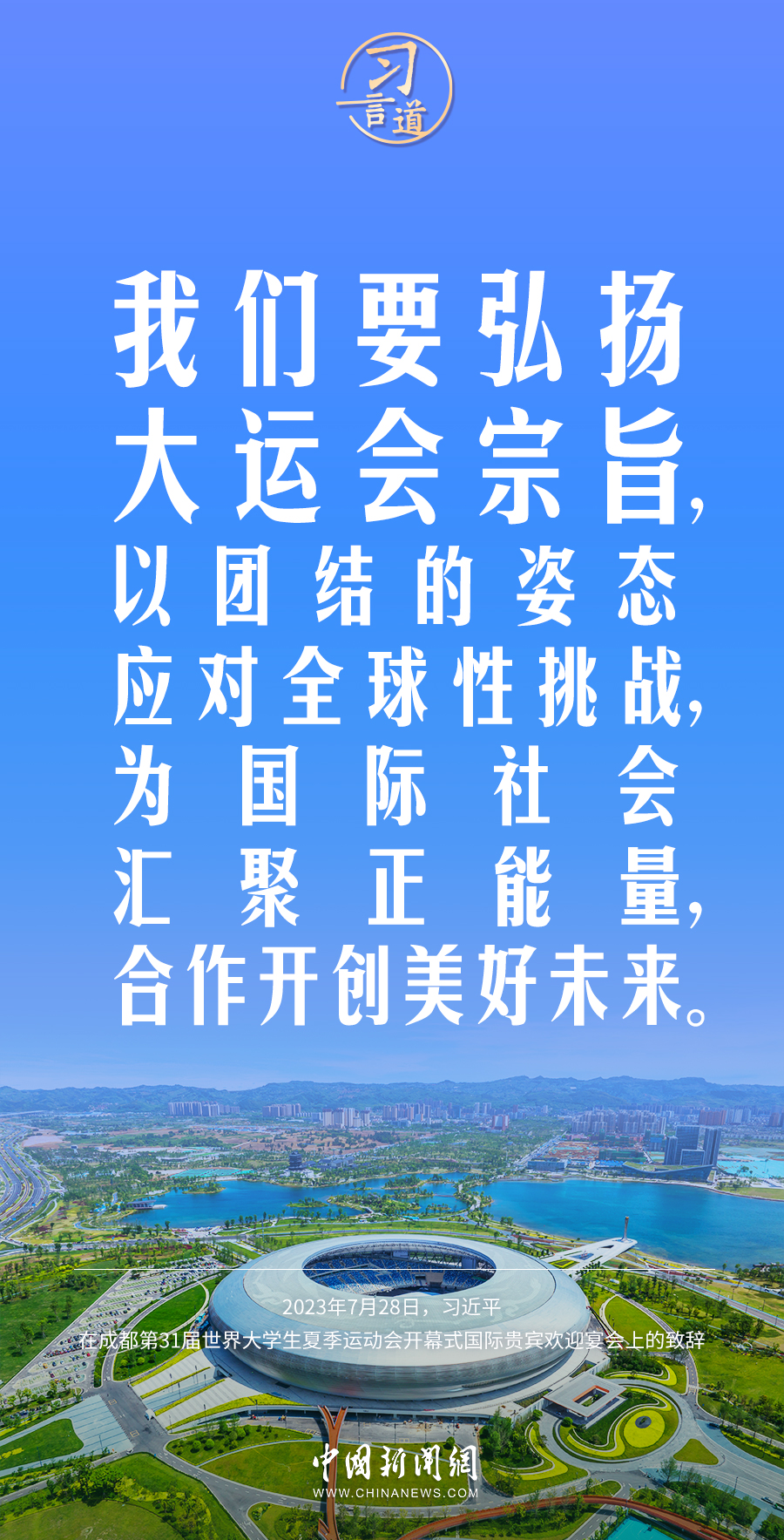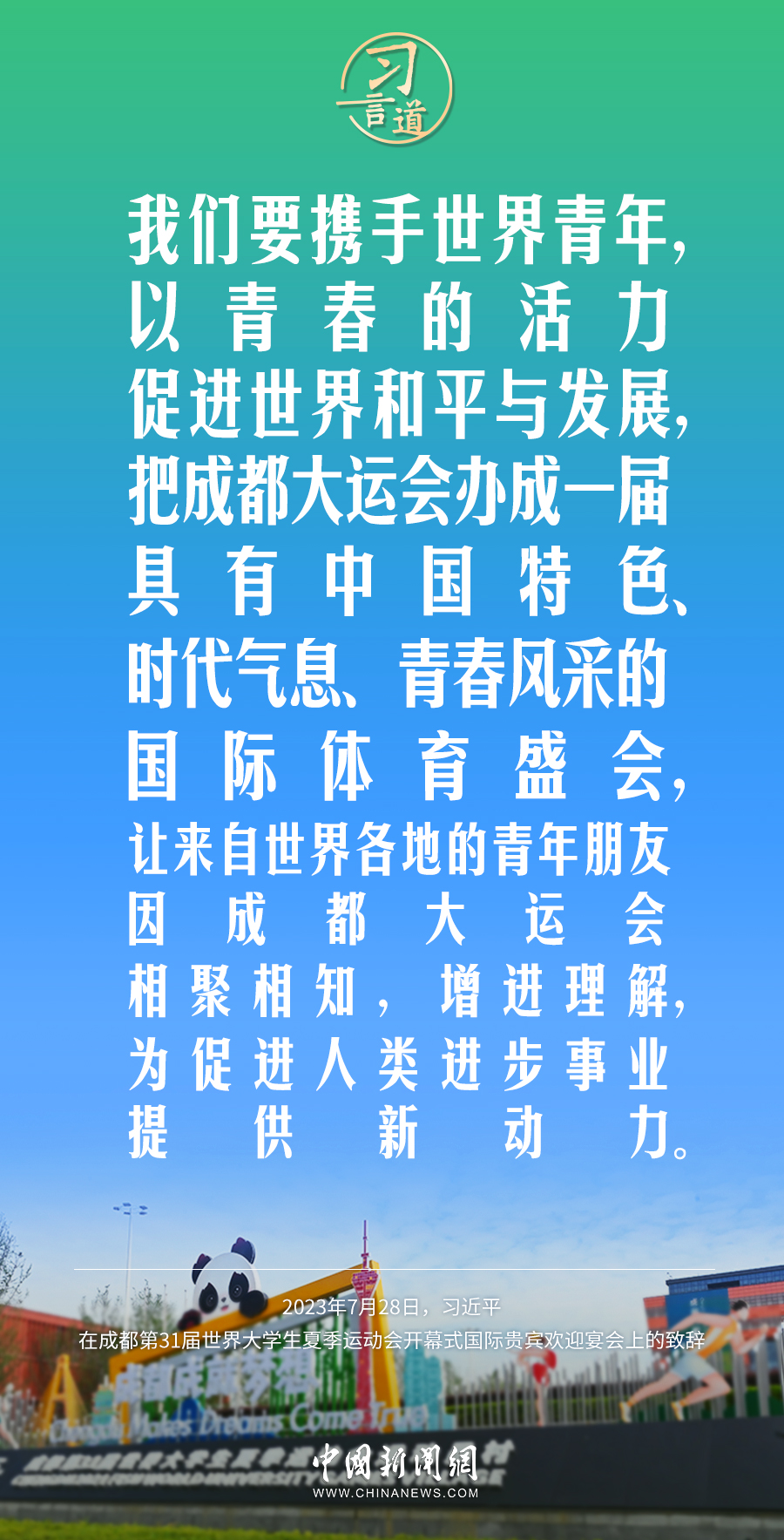 7月28日中午,国家主席习近平和夫人彭丽媛在四川省成都市金牛宾馆举行宴会,欢迎出席成都第31届世界大学生夏季运动会开幕式的国际贵宾。习近平发表致辞称——