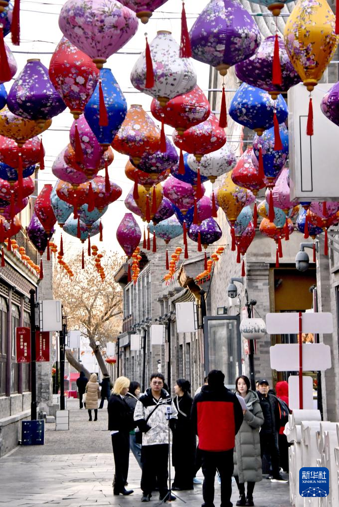 1月13日拍摄的悬挂花灯的北京前门商业区。新华社记者 李欣 摄