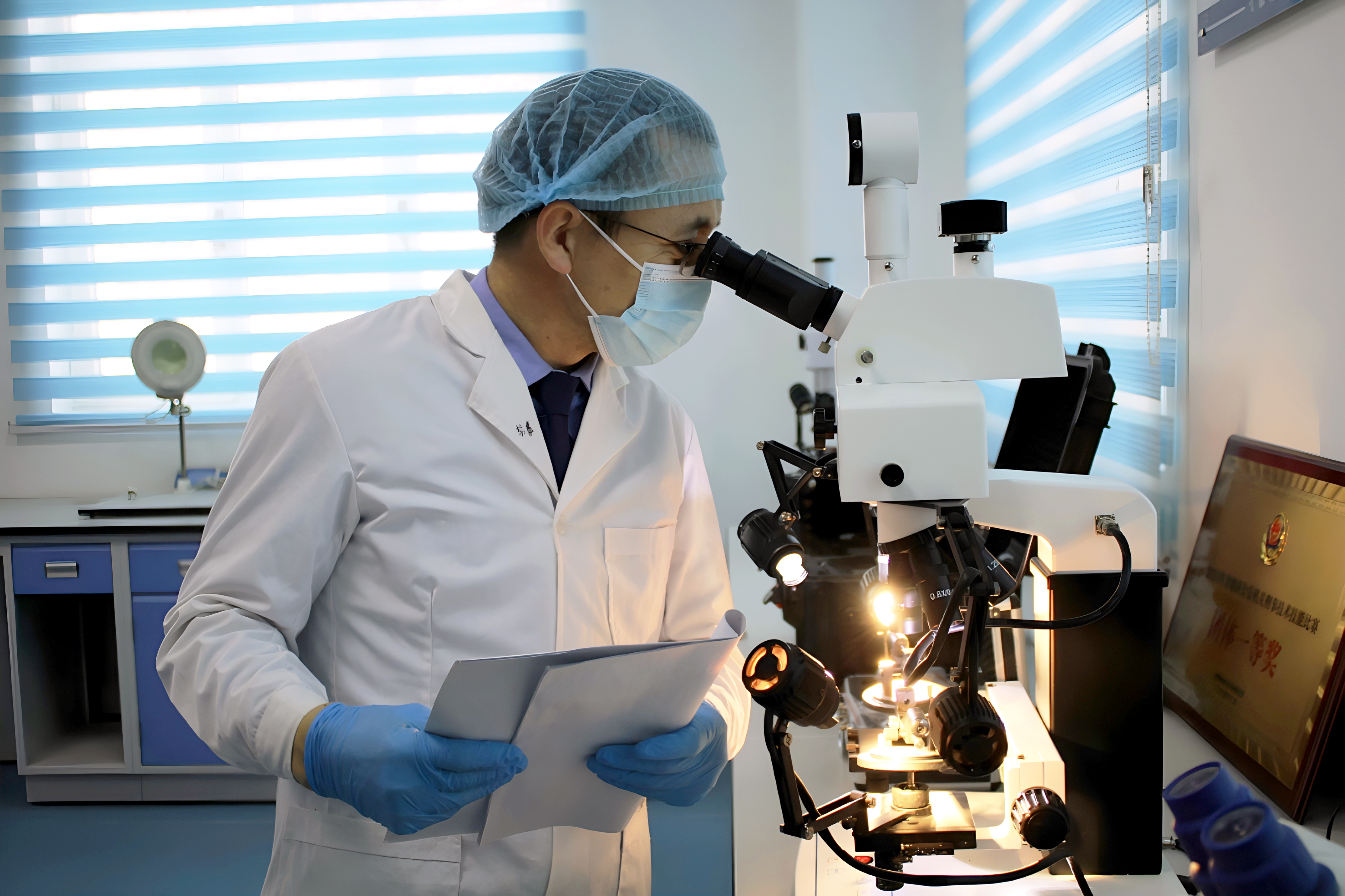 富蕴县公安局刑事侦查大队法医努尔萨吾列提•胡尔曼汗观察物证切片。