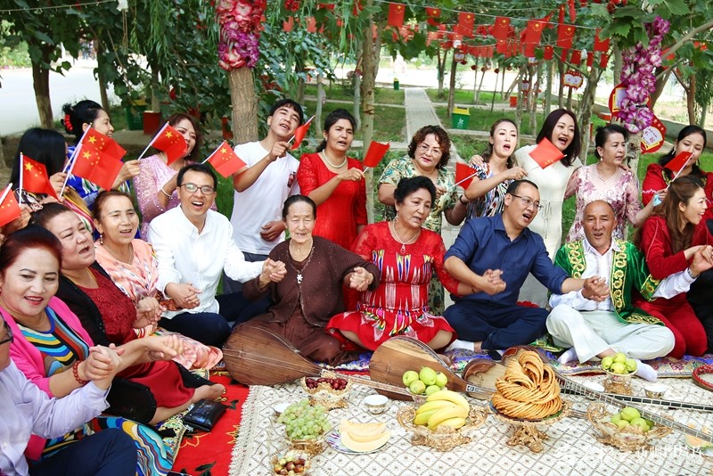 浙江省宁波市援疆干部、库车市融媒体中心职工与库车市萨克萨克街道惠民社区居民同唱《我和我的祖国》,表达对伟大祖国的祝福(2020年10月1日摄)。尼亚孜·热合曼摄
