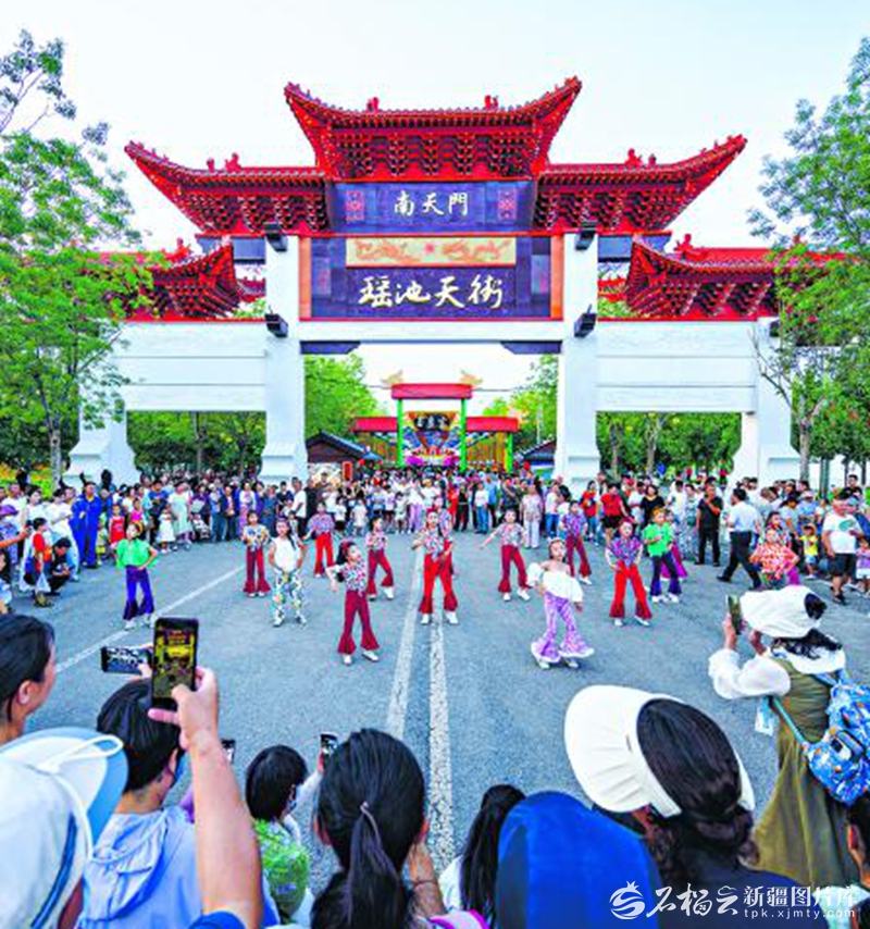 7月2日,游客在观看舞蹈表演。当日,阜康市沉浸式体验夜游主题文化街区——瑶池天街开园。何龙摄