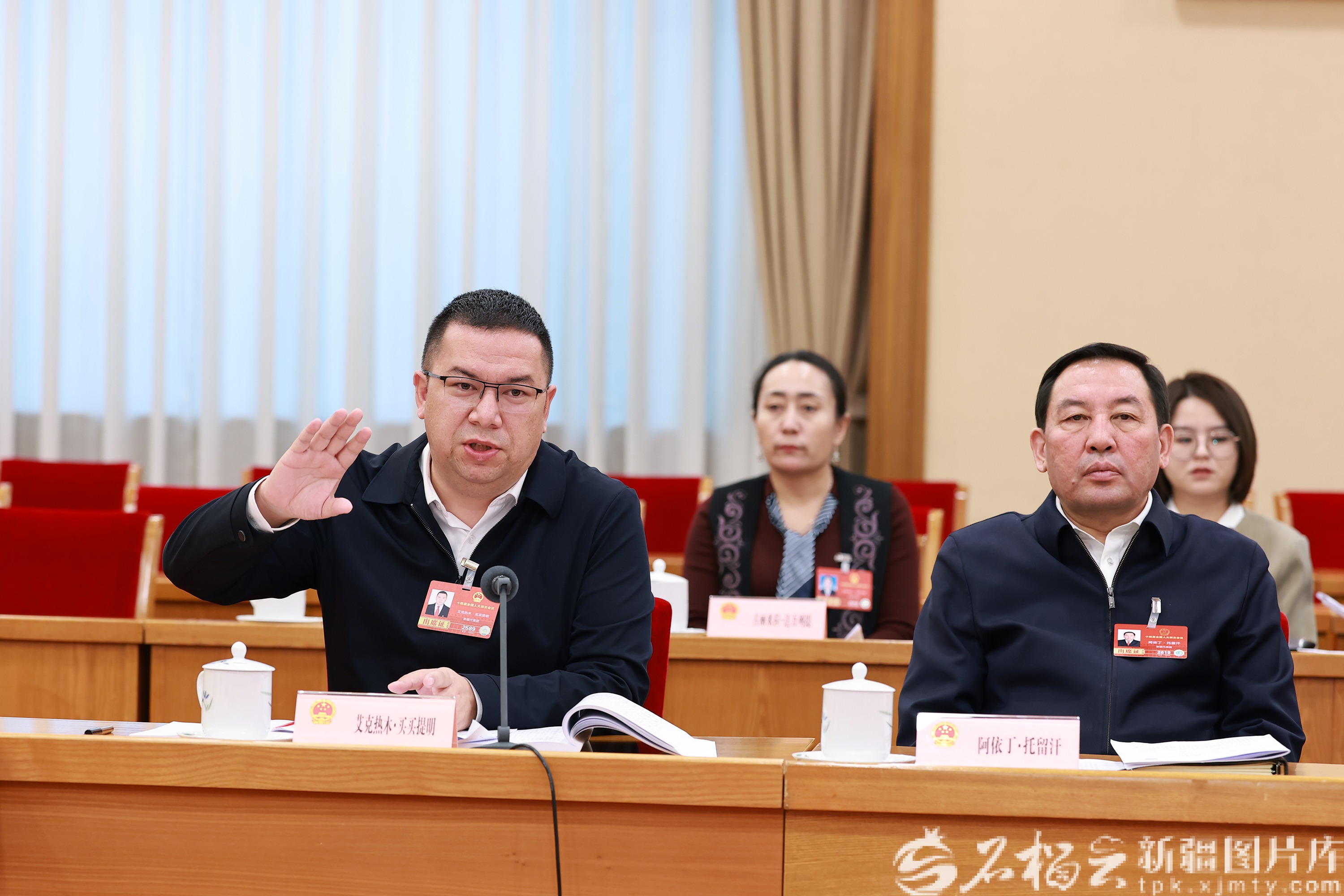 3月8日上午,十四届全国人大四次会议新疆代表团举行小组会议,审议生态环境法典草案。图为艾克热木·买买提明代表(前左)在发言时就法典出台后相关配套政策及时跟进完善,对西部地区给予更多支持以更好推动法律实施、政策落地等提出建议。天山网-新疆日报记者 崔志坚摄